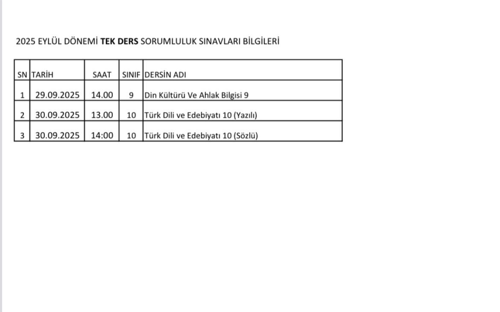 Okulumuz beklemeli durumunda olan Öğrencilerimizin Tek Ders Sorumluluk sınav tarihleri belirlenmiştir ilgili öğrencilerimize duyurulur..
